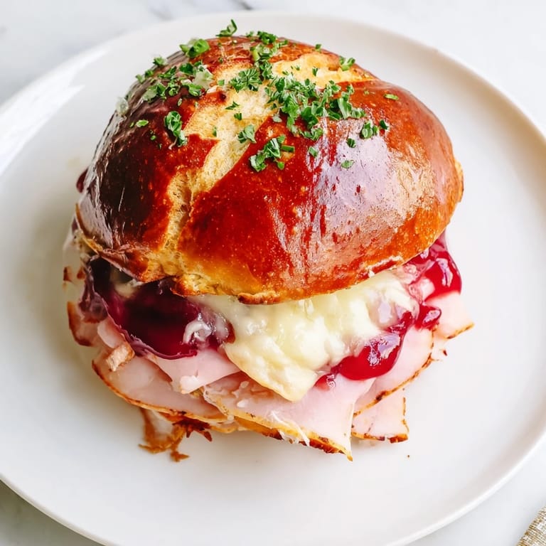 Pin It A playful twist on the classic ham and cheese slider, featuring a tangy cherry glaze that brings a sweet and savory kick to every bite. Perfect for parties, game days, or a family-friendly dinner.