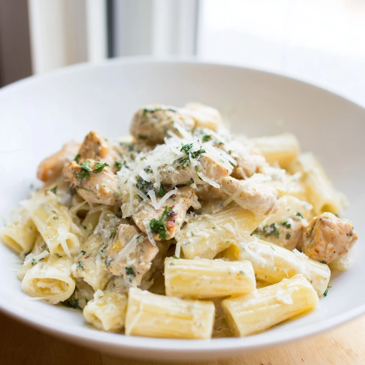 Pin It A comforting pasta dish featuring tender chicken, a rich garlic-Parmesan cream sauce, and perfectly cooked rigatoni. Ideal for a cozy weeknight meal or entertaining guests.