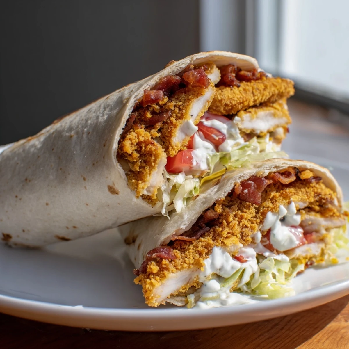 Pin It Experience the crunchy goodness of crispy chicken strips paired with savory bacon, fresh veggies, and creamy ranch, all wrapped in a warm tortilla. Its a flavor explosion in every bite!