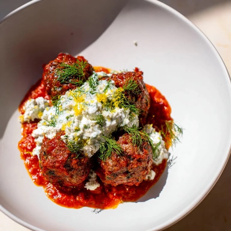 - Serve meatballs hot with sauce, topped generously with Lemon-Feta Sauce and extra herbs or lemon zest if desired.