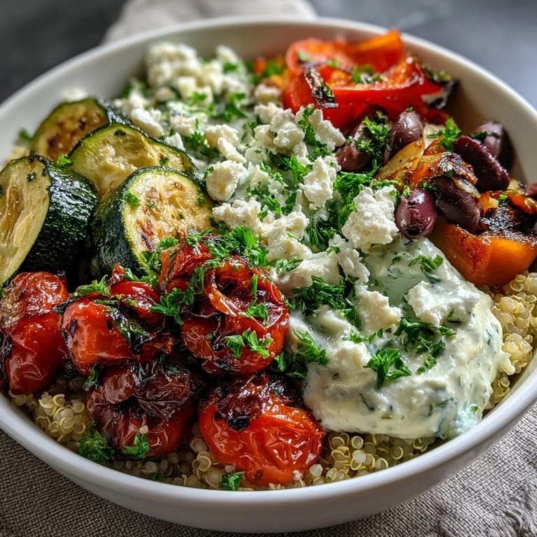 This bowl is endlessly adaptable without becoming something unrecognizable. Swap the roasted vegetables for whatever you have on hand—eggplant, asparagus, Brussels sprouts, or cauliflower all work gorgeously. The structure stays the same: a grain base, roasted vegetables, a legume, creamy elements, and something briny to wake everything up. You can absolutely add grilled chicken or shrimp if you want more protein, use brown rice or farro instead of quinoa, or go completely vegan by swapping the Greek yogurt for a plant-based version and skipping the feta entirely. The point is the balance and flavor combination, not the specific ingredients.