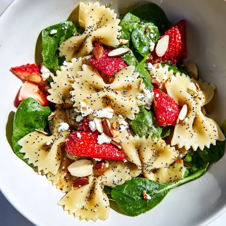 Pin It My neighbor showed up at my door one Saturday morning with a bowl of this salad, still cool from her fridge, and I stood there in my pajamas eating it with the serving spoon. The strawberries were so ripe they stained the pasta pink in spots, and the poppy seeds gave every bite this gentle crunch I couldn't stop chasing. She laughed and said she'd made too much, but I think she just wanted to share something that tasted like the season finally turning. I asked for the recipe before she even made it down the porch steps.