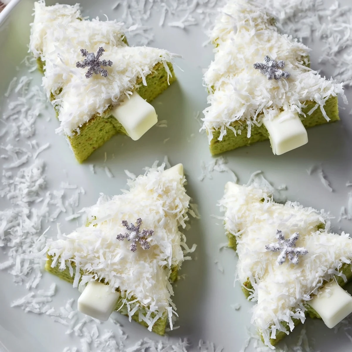 Serve this dessert chilled alongside a glass of late-harvest Riesling or Champagne to balance the sweetness. The festive pine tree shapes and snowy coconut will enchant guests, making it an exquisite centerpiece for your holiday table.