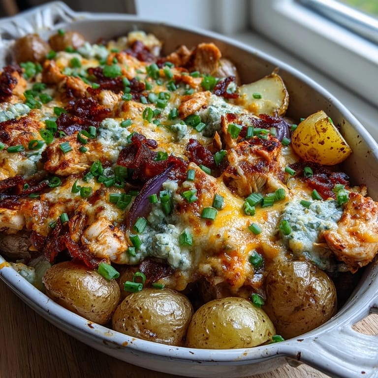 Pin It My sister called me in a panic one Sunday afternoon, asking if I could bring something substantial to her place because her teenage kids had suddenly invited friends over. I rifled through my kitchen cabinets, grabbed what I had, and threw together this buffalo ranch chicken potato bake while she was still on the phone. Twenty minutes later, I was sliding it into the oven, and by the time I arrived at her house, the aroma had already worked its magic—everyone wanted the recipe before they'd even finished eating.