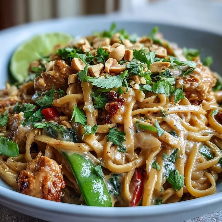 Pin It One humid afternoon, I was craving the kind of noodle dish that tastes like you spent hours layering flavors, but honestly feels thrown together in twenty minutes. I'd been thinking about Thai takeout all week, but something about making it at home with ground chicken and crispy vegetables felt more satisfying. The real trick I discovered was cooking everything in one pan, letting the noodles soak up all that creamy peanut sauce while the vegetables stay snappy and alive. It became my go-to weeknight answer to cravings.
