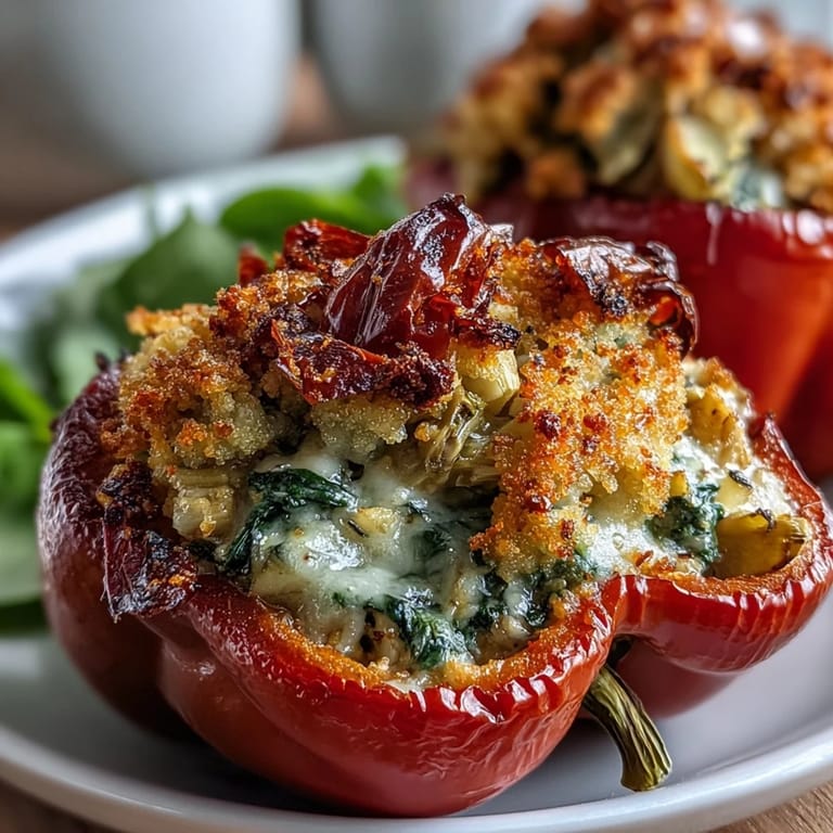 Pin It A friend called me on a rainy Tuesday asking if I could veganize her favorite spinach and artichoke dip, and instead of suggesting a side dish, I thought: why not stuff it into a pepper? The first batch came out slightly watery, the cashew cream hadn't blended long enough, but something about those golden-topped peppers felt right. Now whenever I make them, I remember that happy accident that turned into something I actually crave.